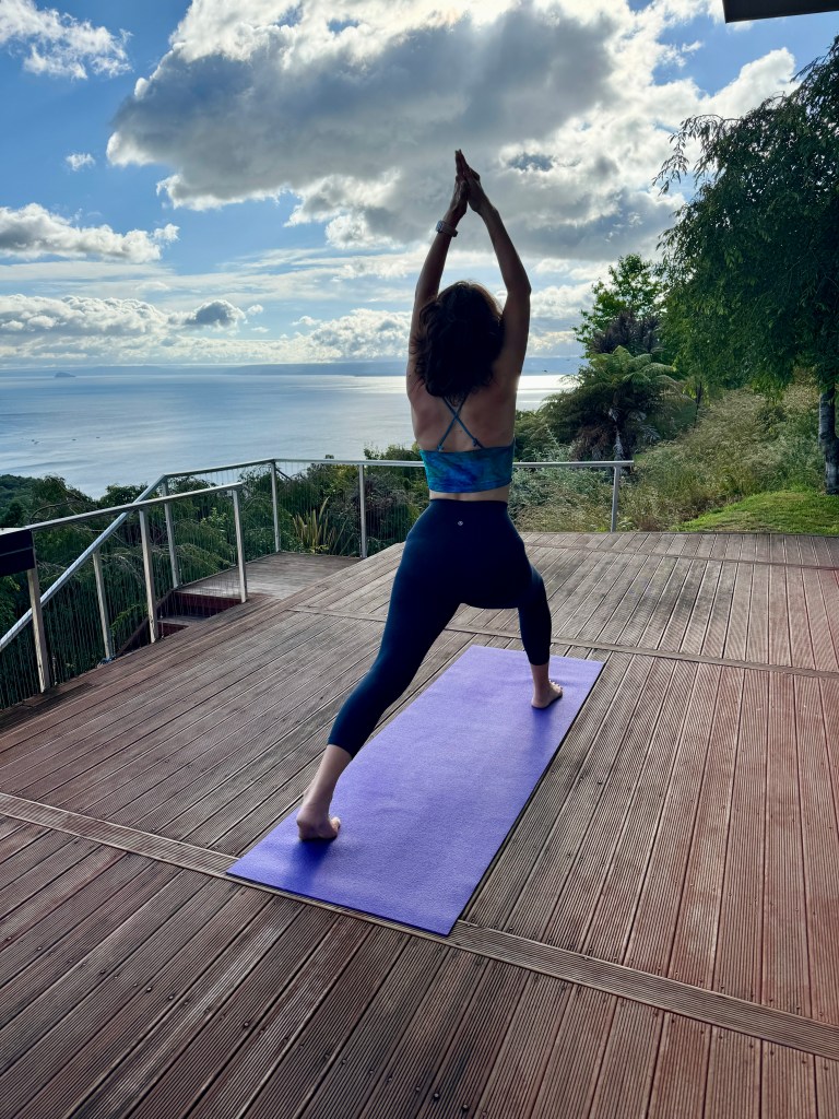 Vanessa, her outdoor yoga space in nature overlooks Lake Taupo.